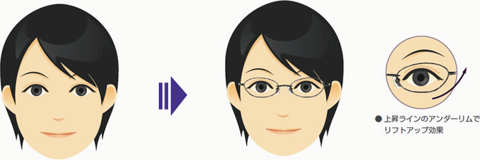 お顔の外側に向かって上昇ラインを持つアンダーリム(メガネフレームの下のライン)には、フェイスラインをすっきり見せる『リフトアップ効果』があります。フェイスラインが気になる方に、特にお勧めできるフレームです。